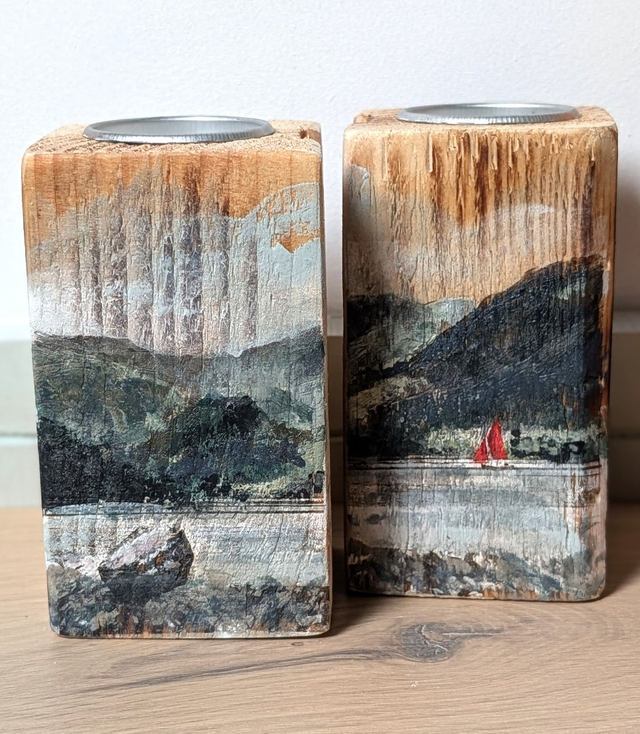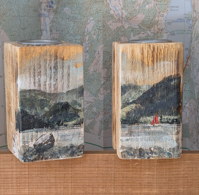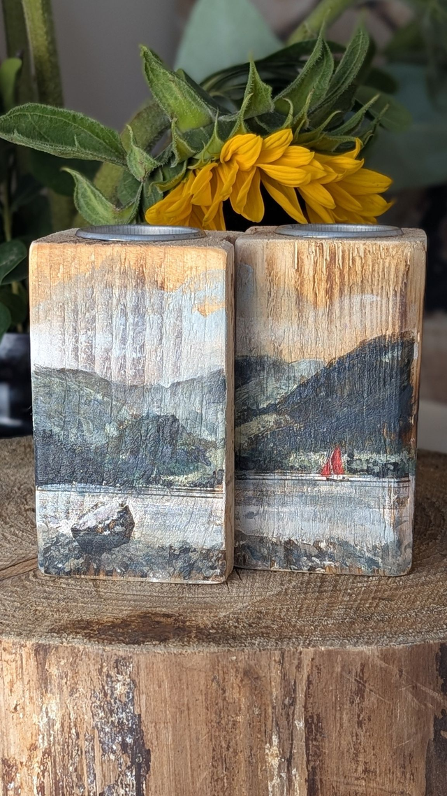 The Lake District - Red boat sailing on the lake - Set of Two Tealight holders Reclaimed wood