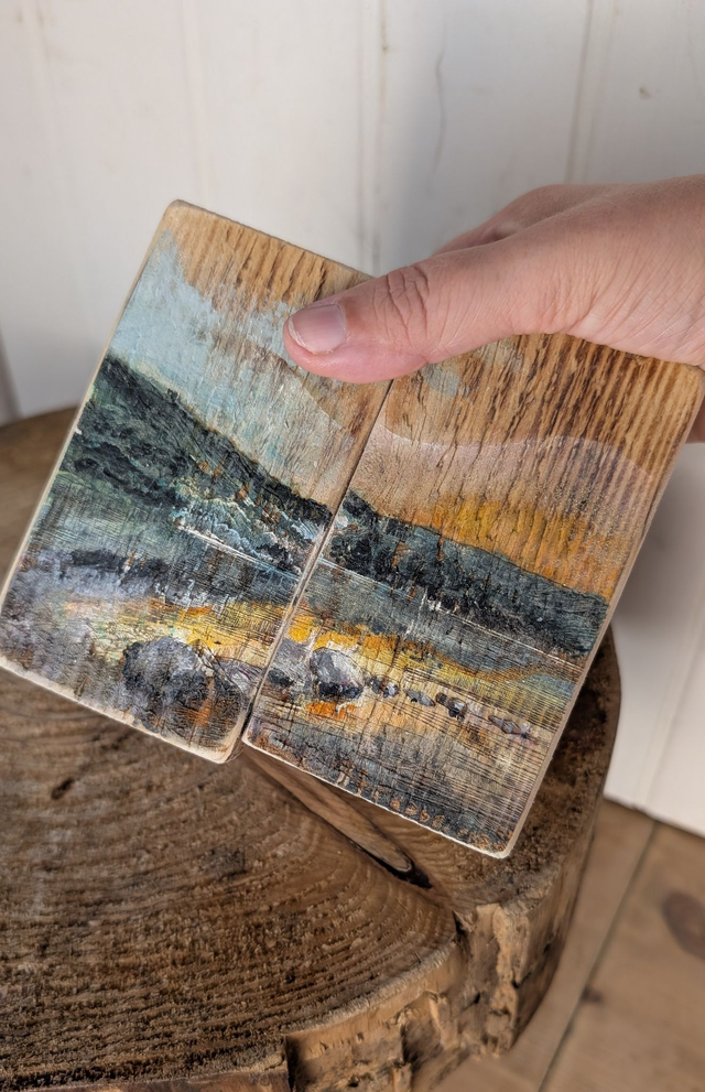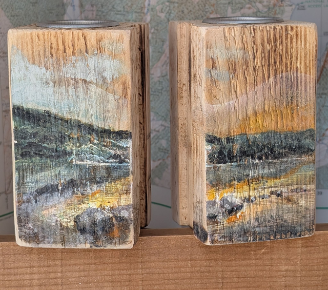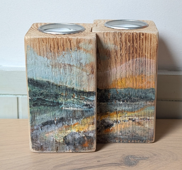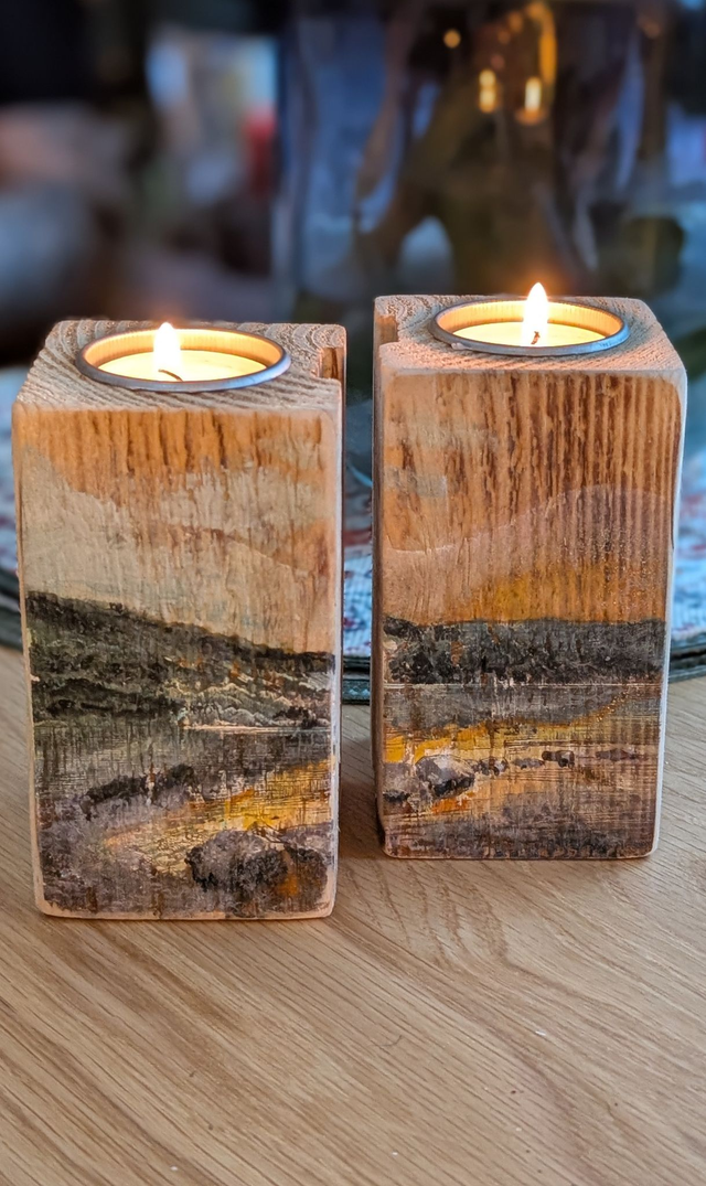 The Lake District - Sunset on Stepping Stones - Set of Two Tealight Holders Reclaimed Wood